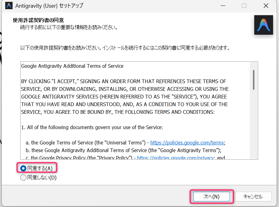 - 内容を確認し、「同意する(A)」にチェックを入れて「次へ(N)」をクリックします。