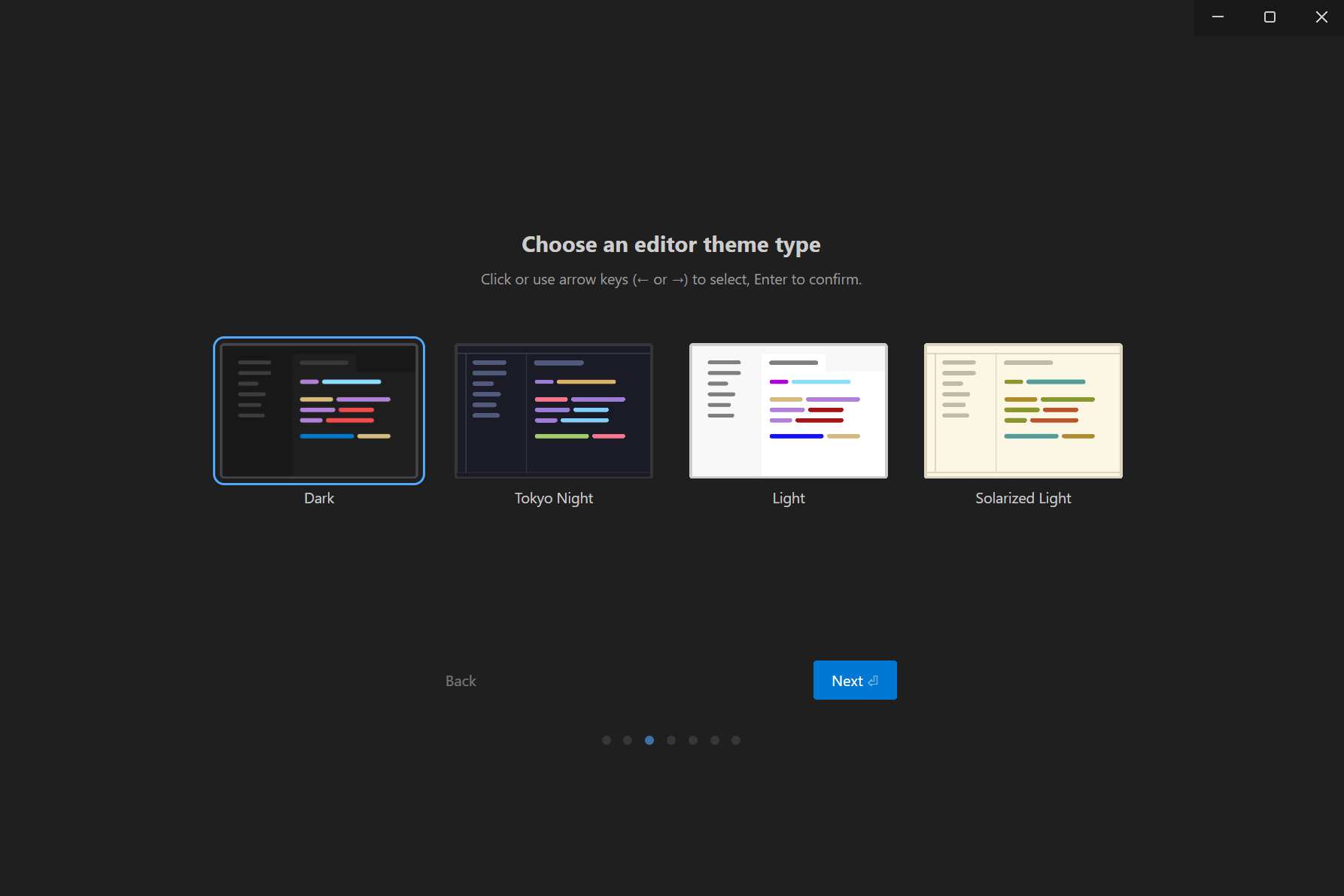 - エディターテーマの選択 「Dark」「Tokyo Night」「Light」「Solarized Light」などから好きなテーマを選びます。