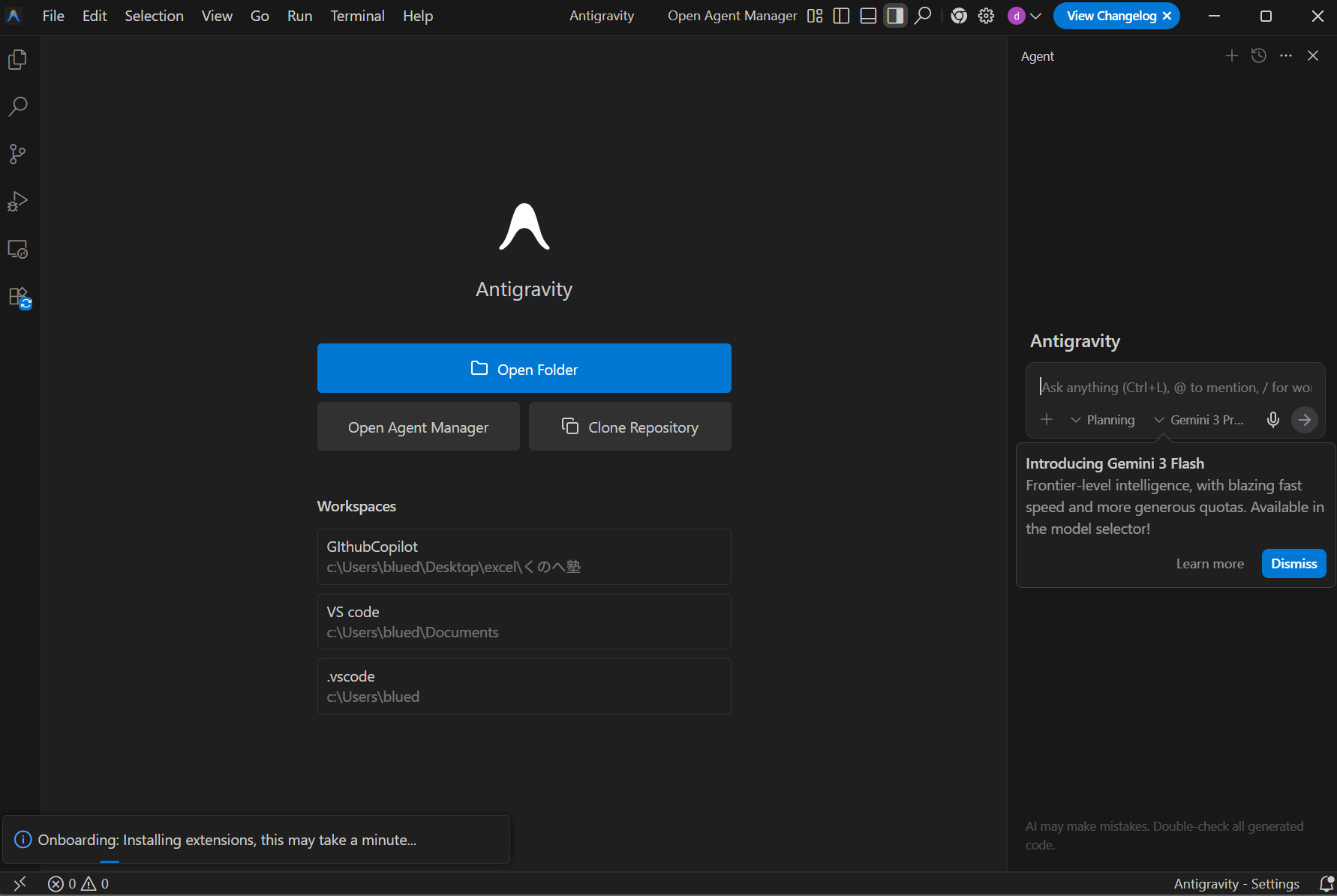 - 以下の画面が出ればAntigravityのインストールは完了です。