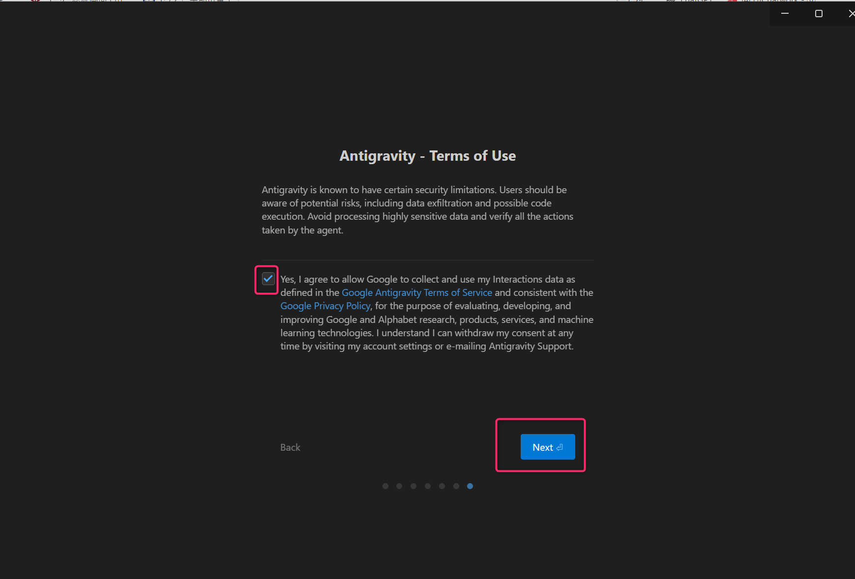 インストールが完了すると、Antigravityが起動します。ここから初期設定を行っていきます。