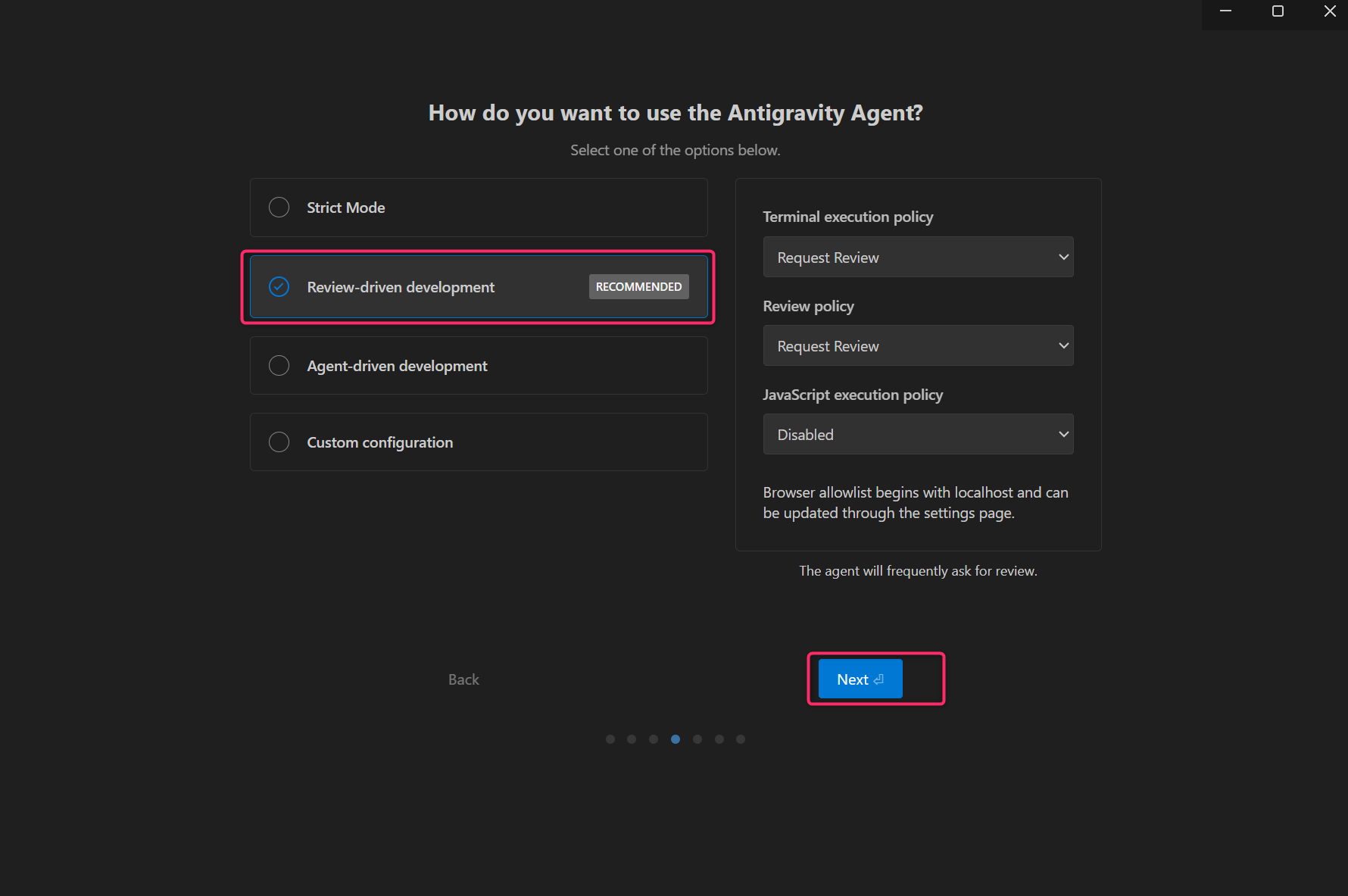 - Antigravity Agent(AI)の動作設定 AIがどのように開発をサポートするかを選択します。
