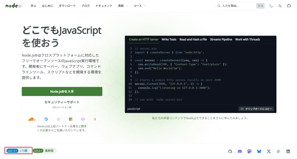 Node.js公式サイト から「推奨版(LTS)」をダウンロードしてインストールしてください。