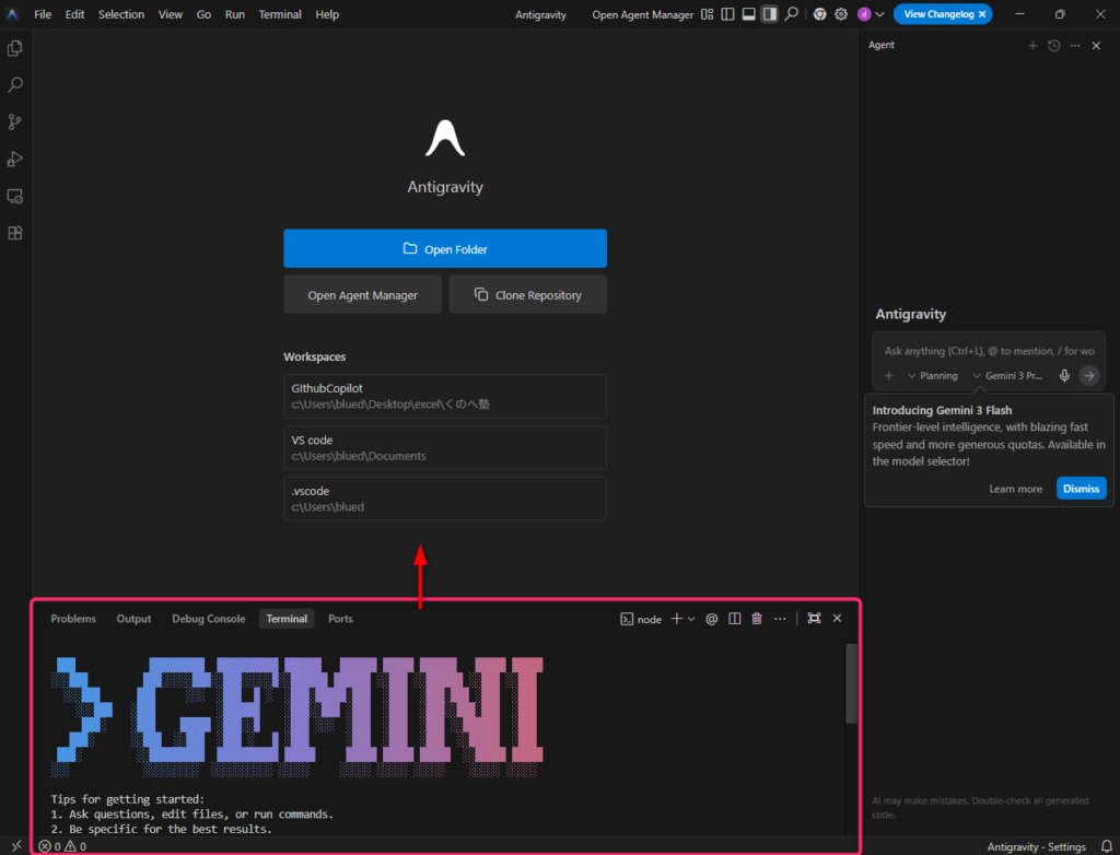 準備段階の要件に入っていたから、というのが一番の理由ですが、どうも 「いつものチャット画面(ブラウザ)ではなく、Antigravityの画面の下にある黒い画面(ターミナル)からでも直接Geminiと会話できる」 ということのようです。