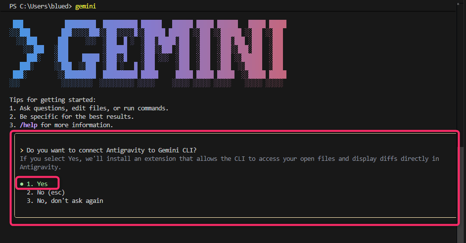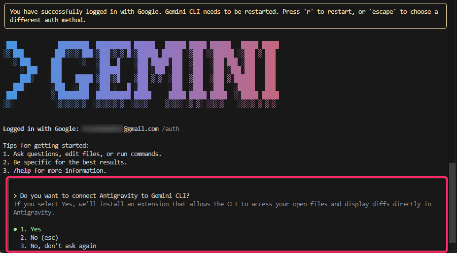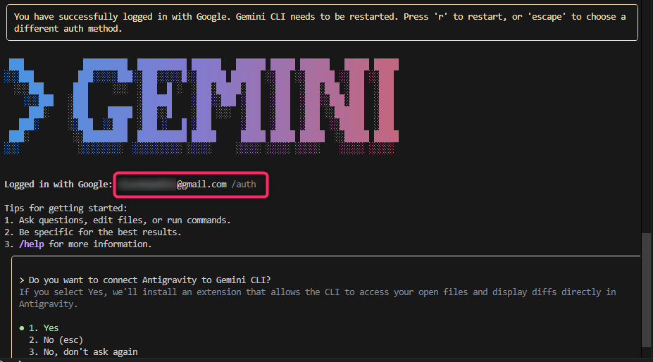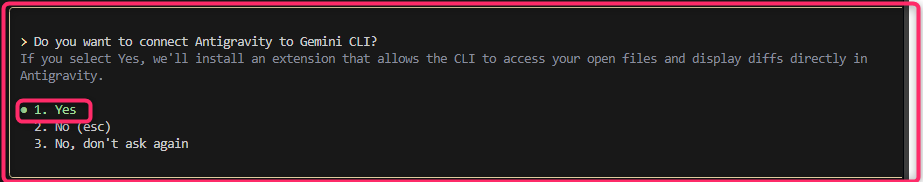 再度Gemini CLIにAntigravityを接続します。先ほどの画面で1を選択してEnter