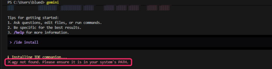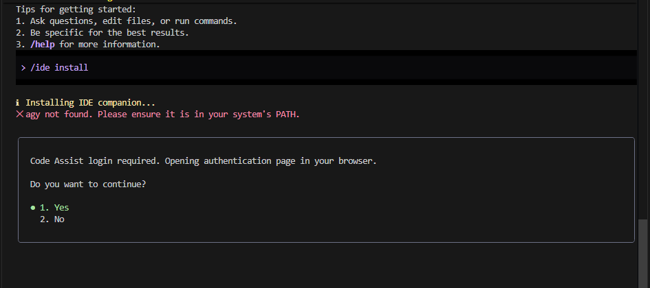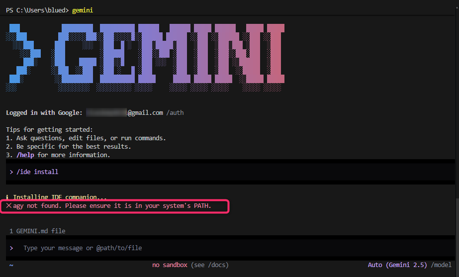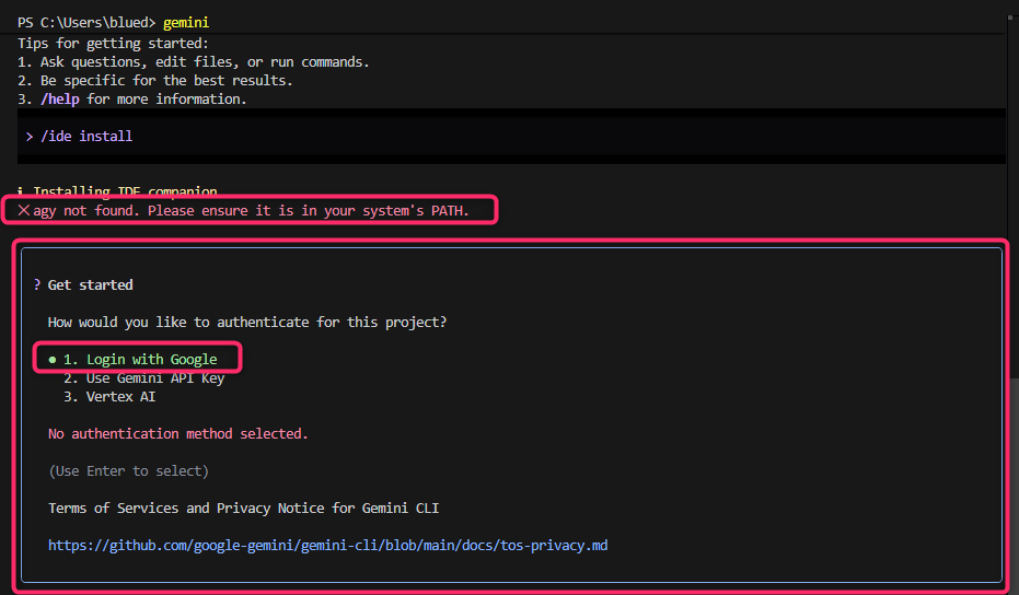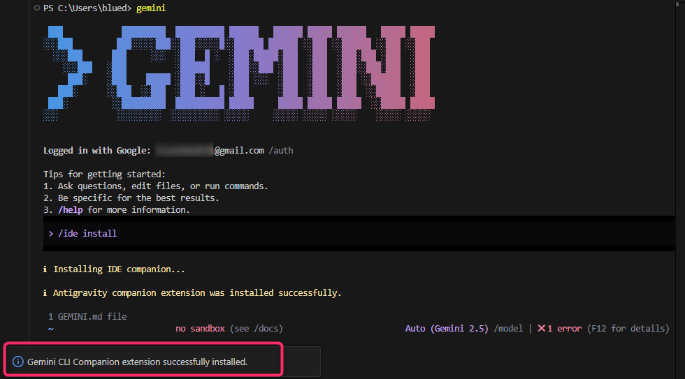 ここまでの設定ができたら、もう一度ターミナルで gemini と入力し、/ide install が自動で走るのを確認します。