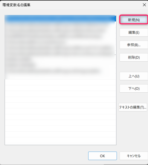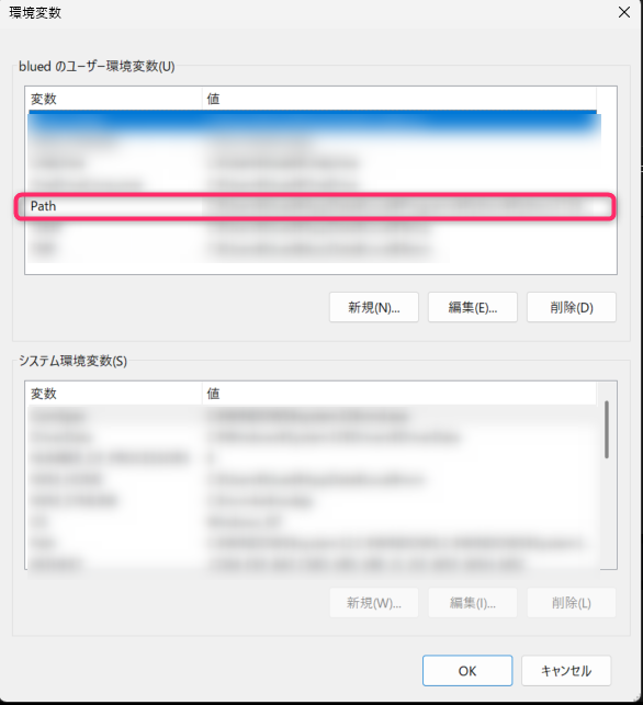 - 上の段(ユーザー環境変数)にある 「Path」 を選んでダブルクリック(または編集)します。