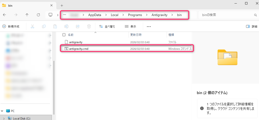[ユーザー名]は自分のものに変えてください)。C:\Users\[ユーザー名]\AppData\Local\Programs\Antigravity\bin