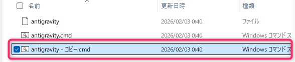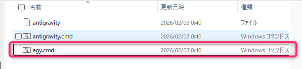 中を見ると antigravity.cmd というファイルはありますが、エラーで探していた agy というファイルがありません。 そこで、antigravity.cmd をコピーして、名前を agy.cmd に変えました。