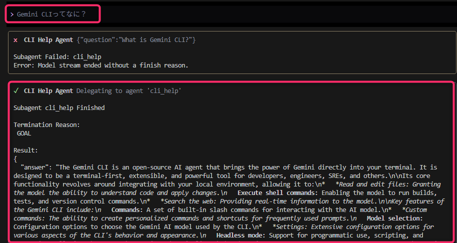 無事に成功しました!このメッセージが出れば連携完了です。 試しに日本語で「Gemini CLIってなに?」と聞いてみると…
