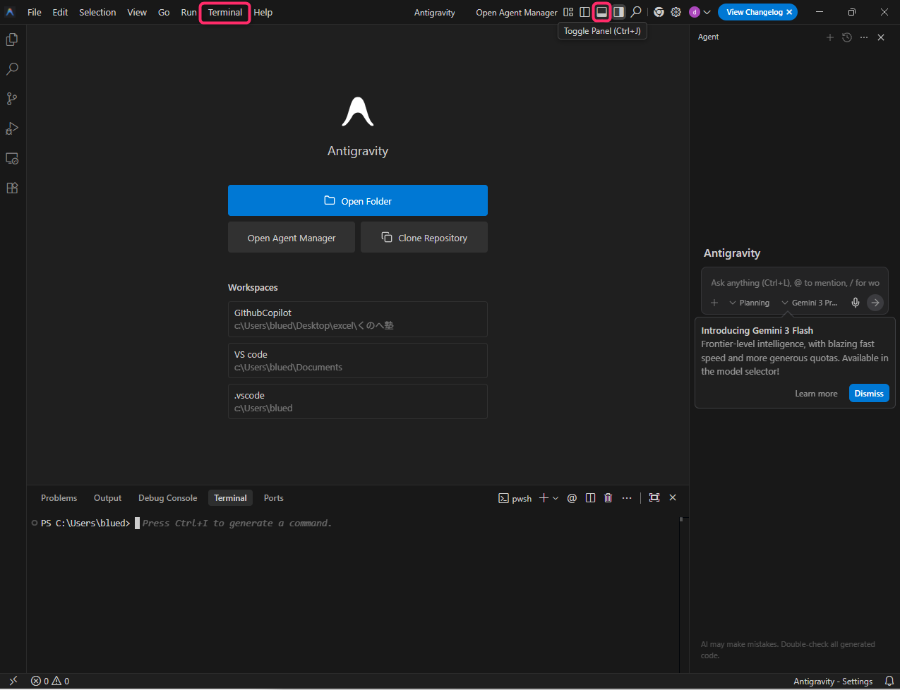 1. Antigravityの上部メニューにある 「Terminal」 をクリックして「New Terminal」をクリックするか、右上の「Toggle Pannel(下にマークがついているもの)」をクリックしてTerminalを開きます。