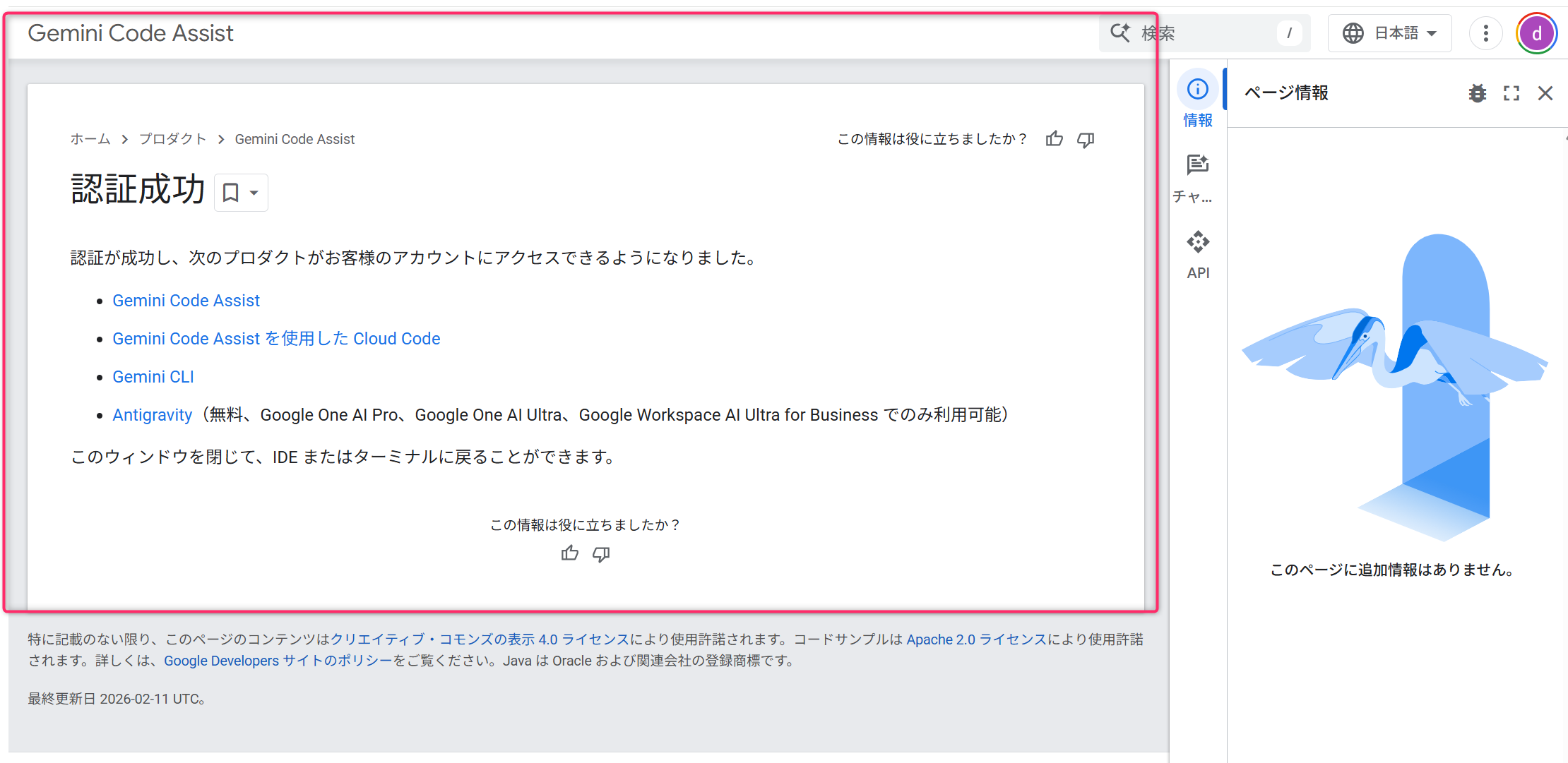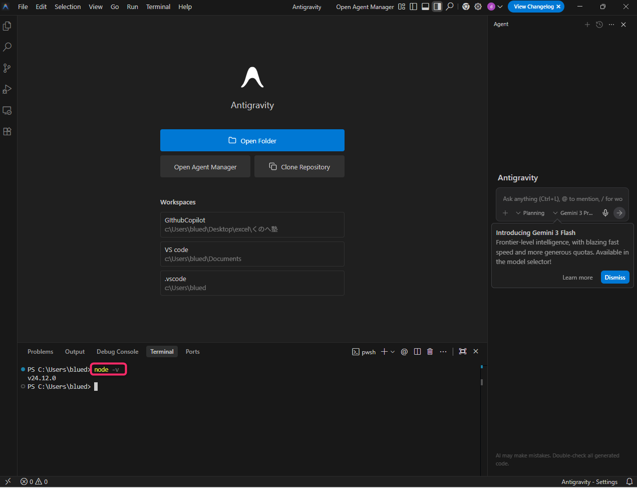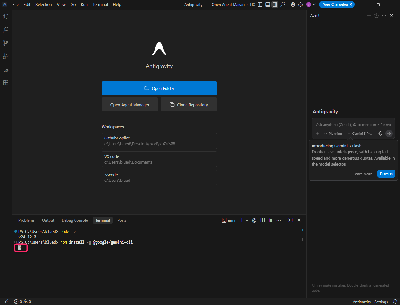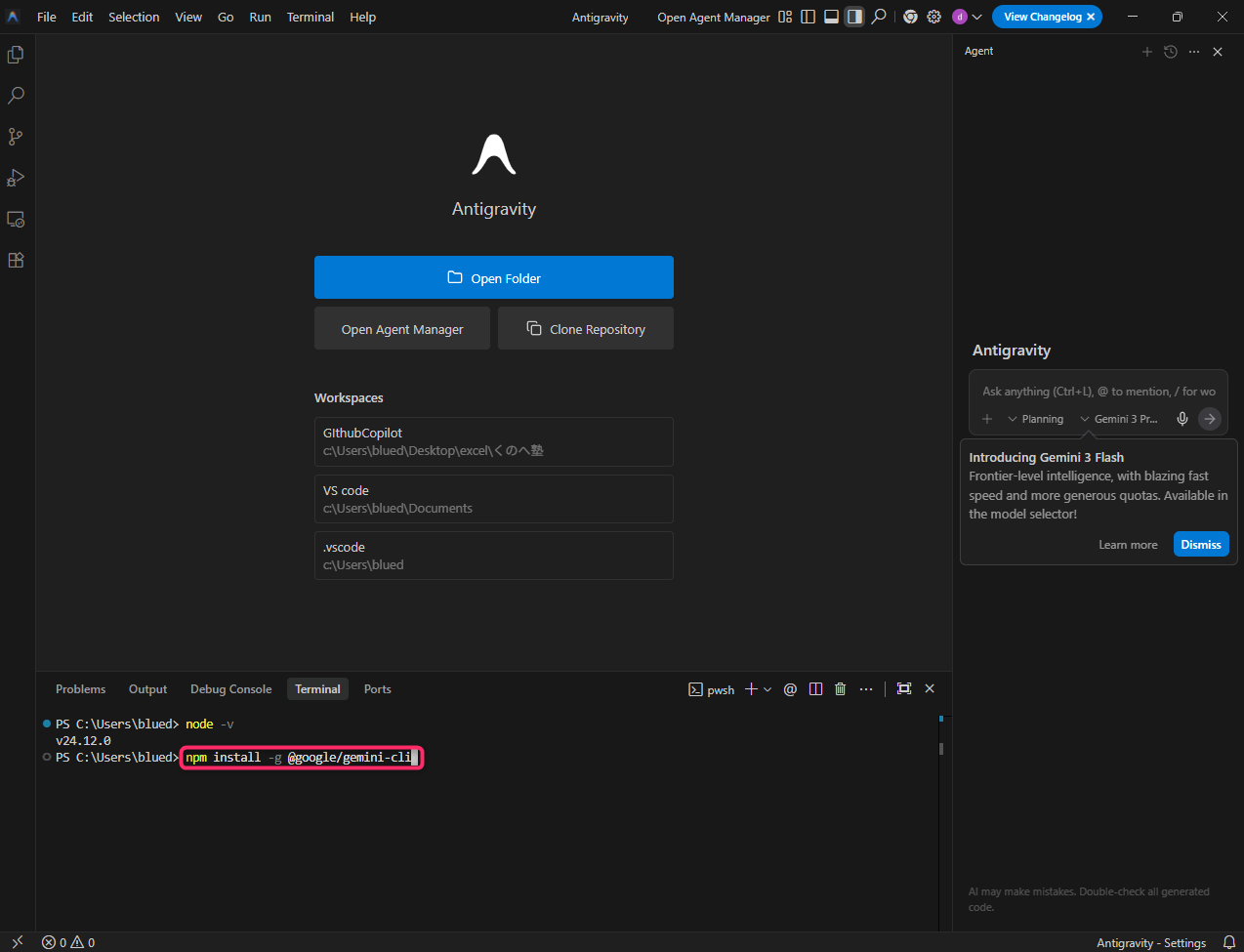 準備段階の要件に入っていたから、というのが一番の理由ですが、どうも 「いつものチャット画面(ブラウザ)ではなく、Antigravityの画面の下にある黒い画面(ターミナル)からでも直接Geminiと会話できる」 ということのようです。