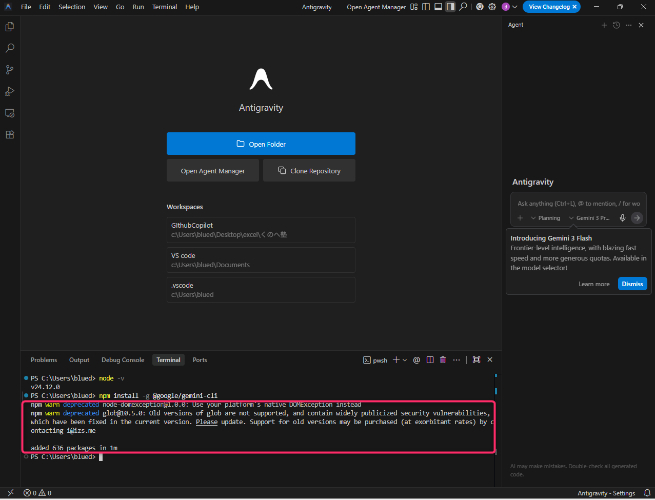 Node.jsで使う便利なツール(今回で言うGemini CLI)をインターネットからダウンロードしてインストールしてくれる「インストーラー」のようなものです。 - Terminal(ターミナル):Antigravityの画面下に出てくる「黒い画面」のことです。