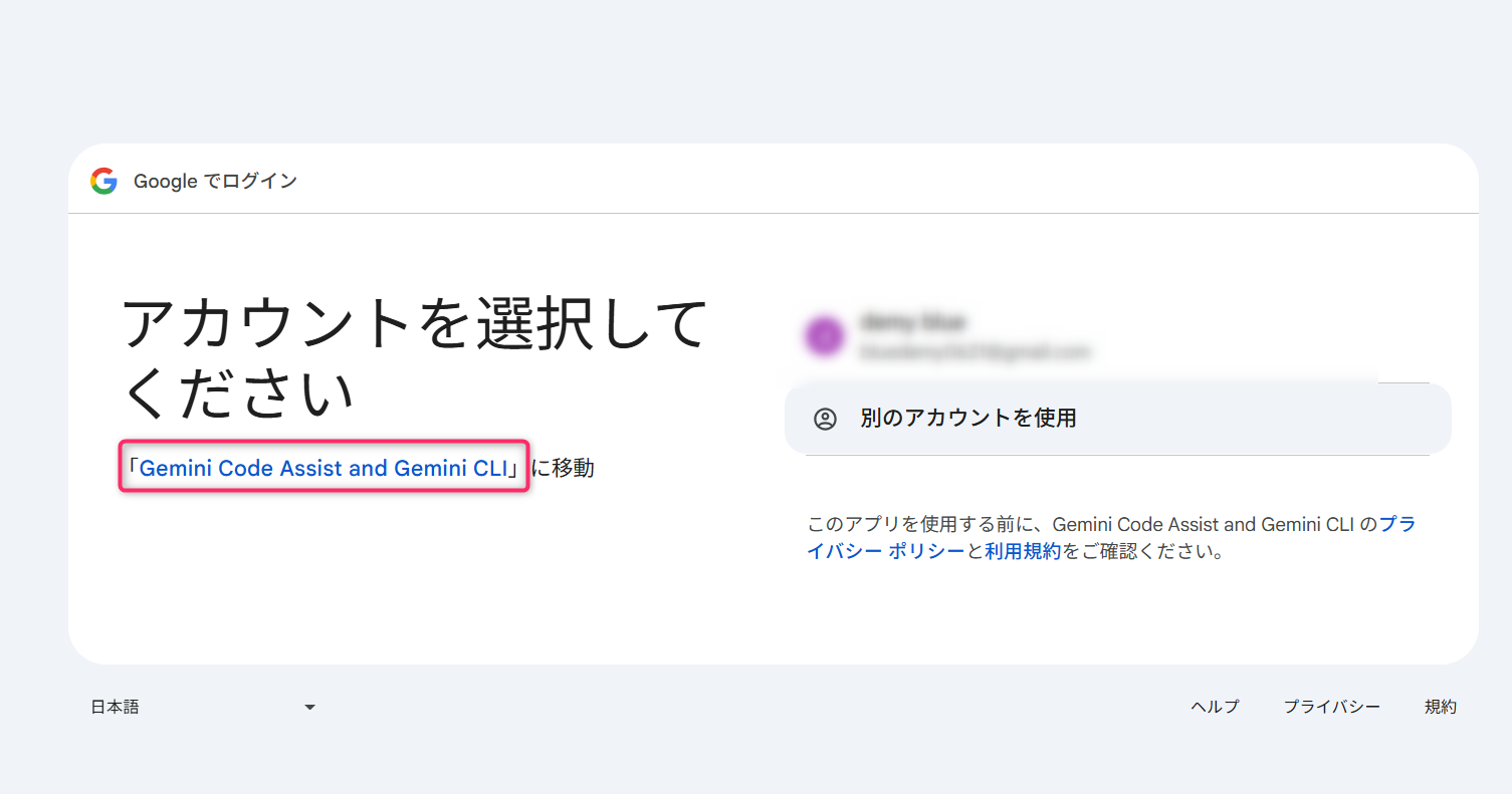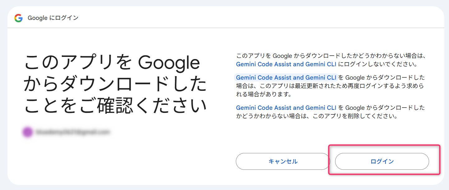 ターミナル画面でGeminiを入力し、メールアドレスが表示されればOKです。
