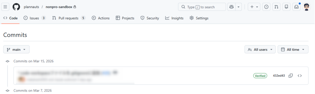 | 3 | ファイル一覧右上 Commits | プッシュが届いているか確認する |