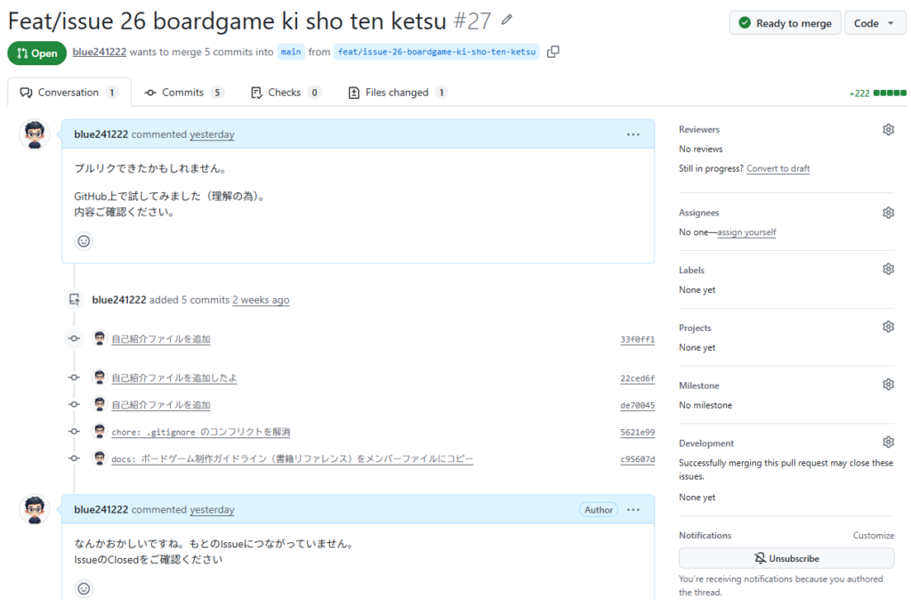 - 一番上に自分のプルリクエストメッセージが表示されていれば、プルリクエストは完了しています。