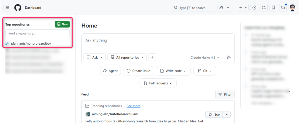 Top repositories(よく使うリポジトリ一覧)が表示されています。 目的のリポジトリ名(例:plannauts/nonpro-sandbox)をクリックします。 - ファイル一覧が見えるリポジトリのTOP画面が開けばOKです。