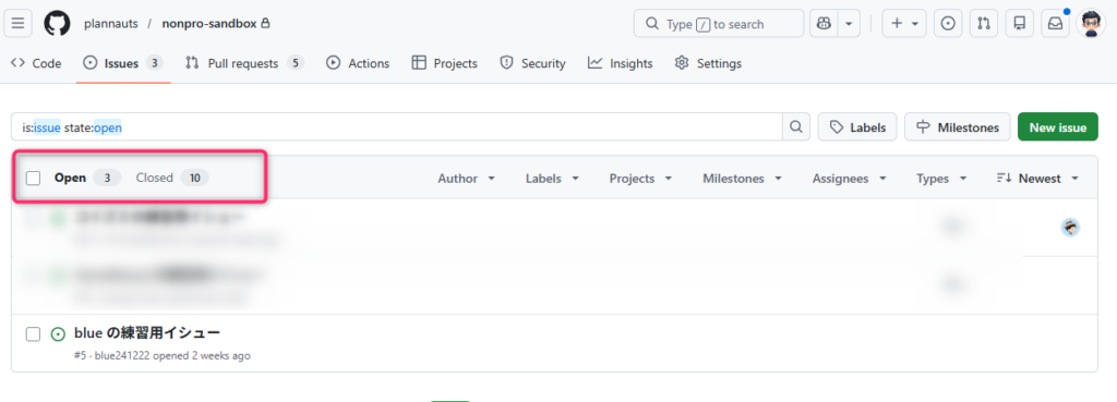 こちらは自分が関わる全プロジェクトのIssueが混ざって表示されるので使いません。 必ず、リポジトリに入ってから上部タブの [Issues] を使ってください。