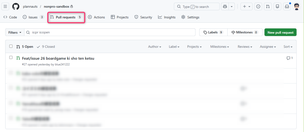 - そこをクリックすると、プルリクエストの履歴一覧が新しい順に並びます。