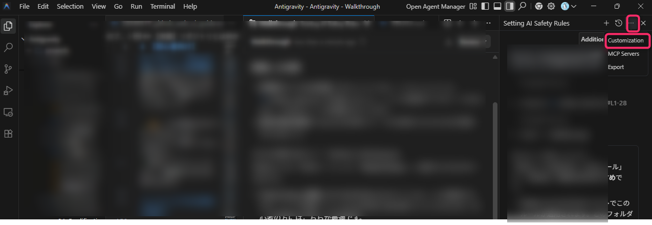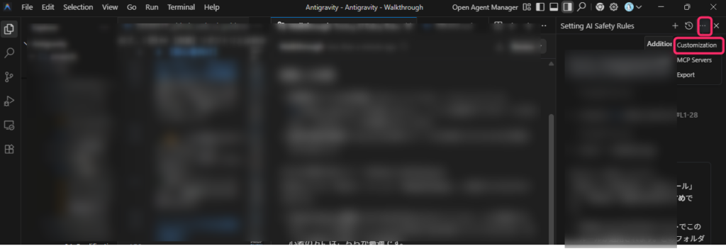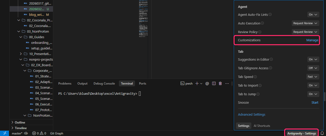 エディタ全体の右下にAntigravity-Settingsがあります。 そこから [Customizations] を選びます。 次に [Manage] の順に進むと設定パネルが開きます。