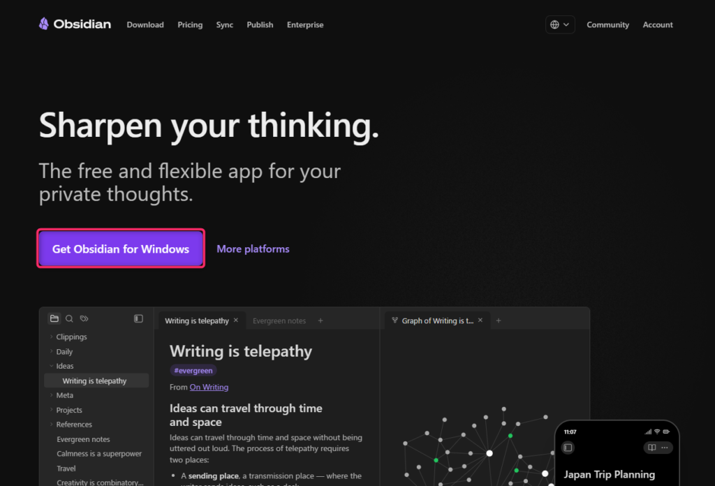 2. 「Get Obsidian for Windows」 をクリックしてインストーラーをダウンロードします。
