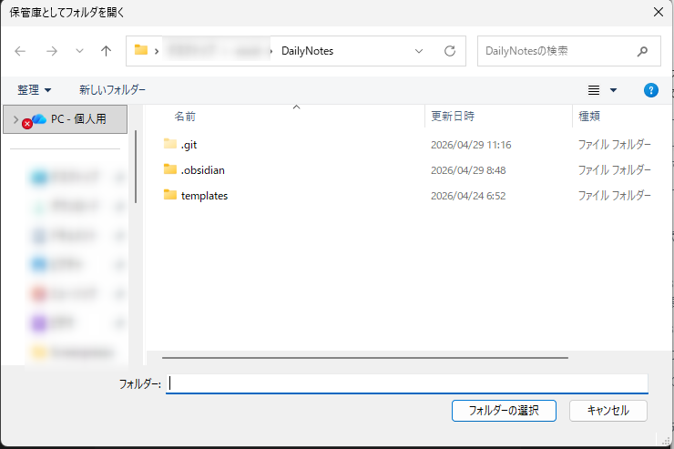 設定を始める前に、まず日記用の専用フォルダ(例:DailyNotes)をPC上の好きな場所に作成してください。