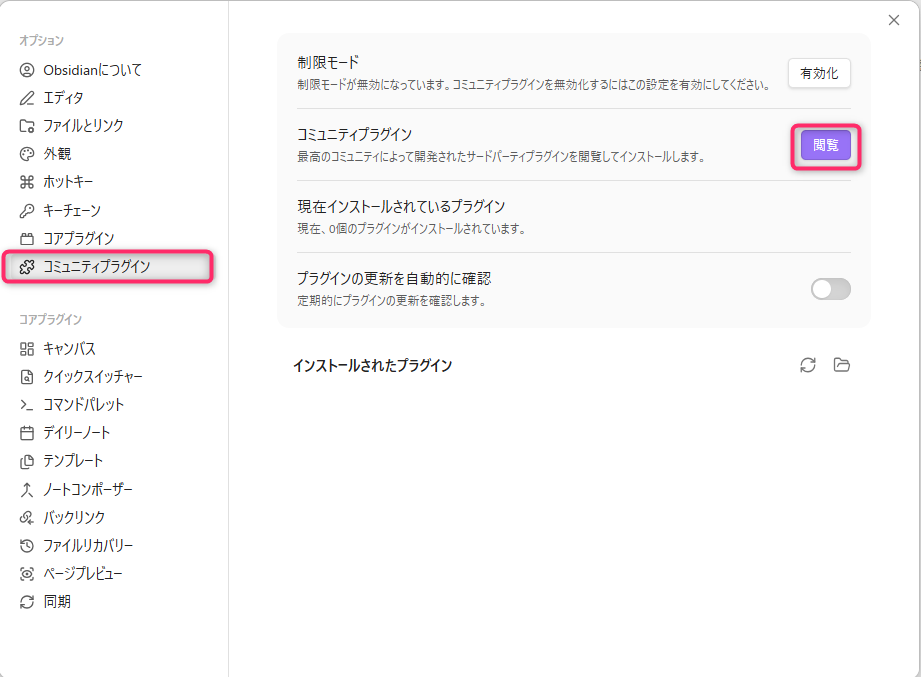 2.左メニューから 「コミュニティプラグイン」 を選択します。「閲覧」 ボタンをクリックします。