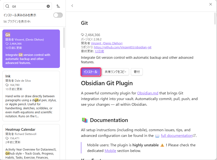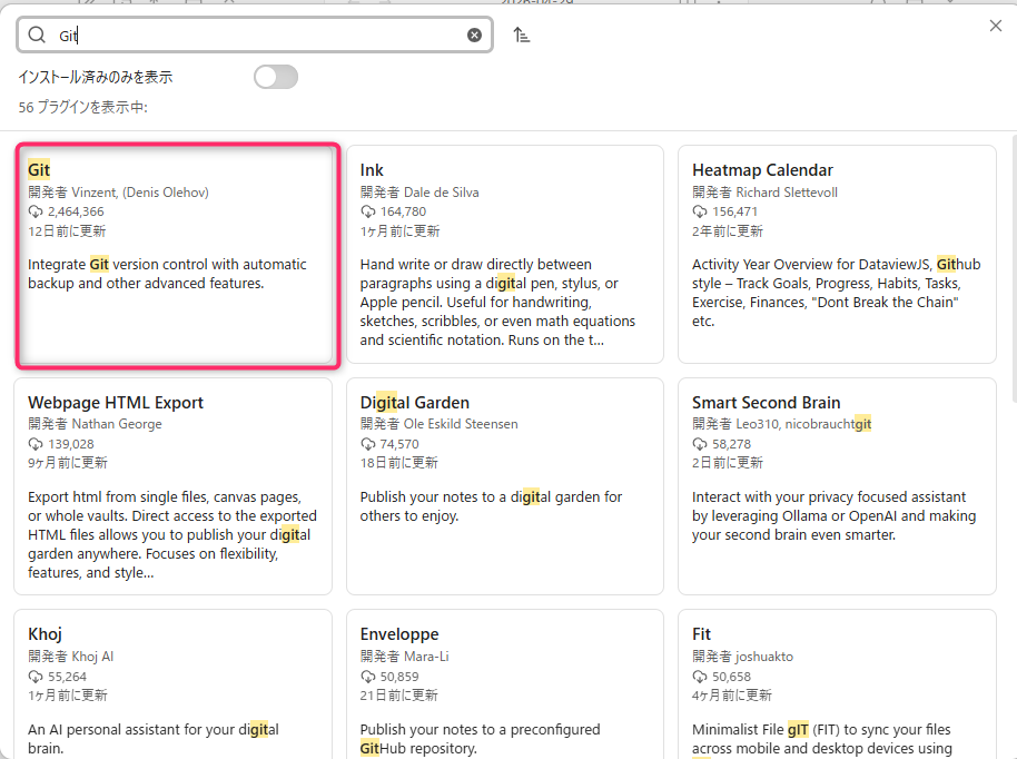 4.「Git」(開発者:Vinzent, (Denis Olehov))を選択し、「インストール」、「有効化」 をクリックします。
