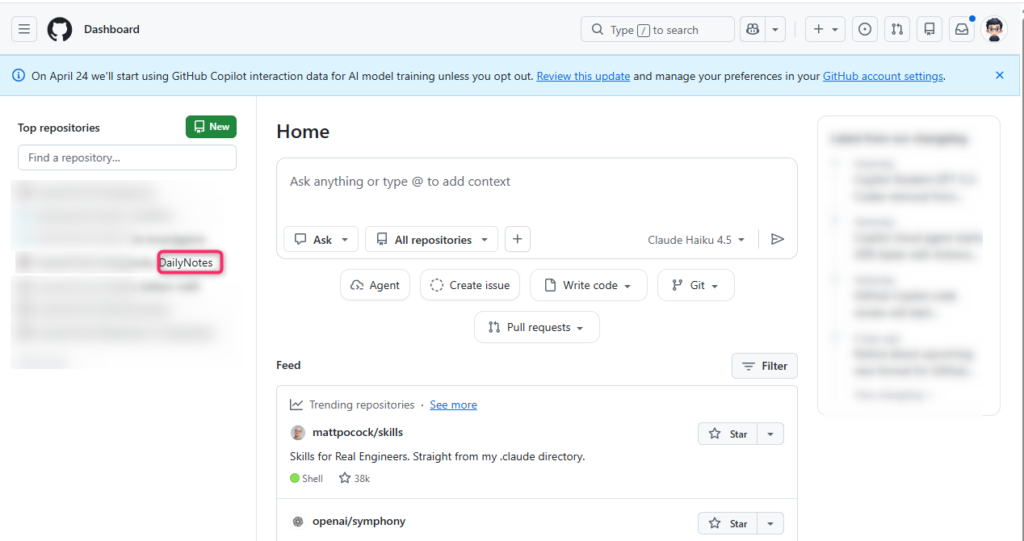 4.リポジトリ一覧から、同期したいリポジトリ(例:DailyNotes)を選択します。