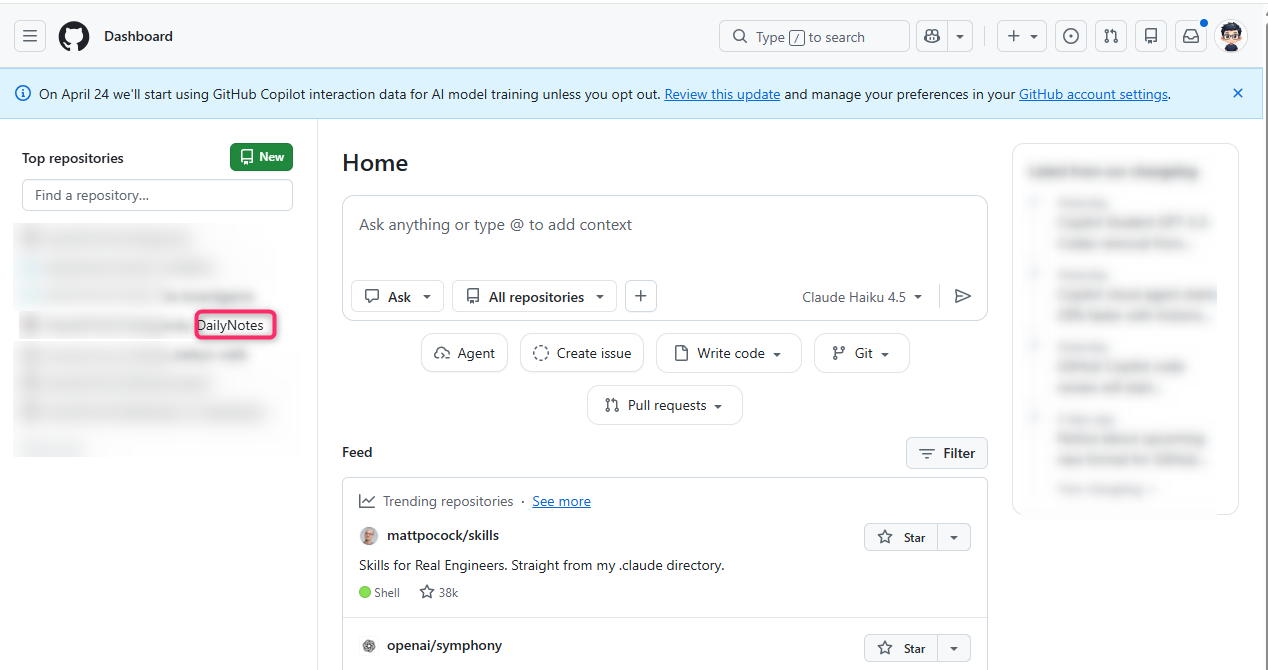 GitHub を開き、自分のリポジトリ一覧にDailyNotesが作成されていて、PCと同じファイルが表示されていれば成功です!