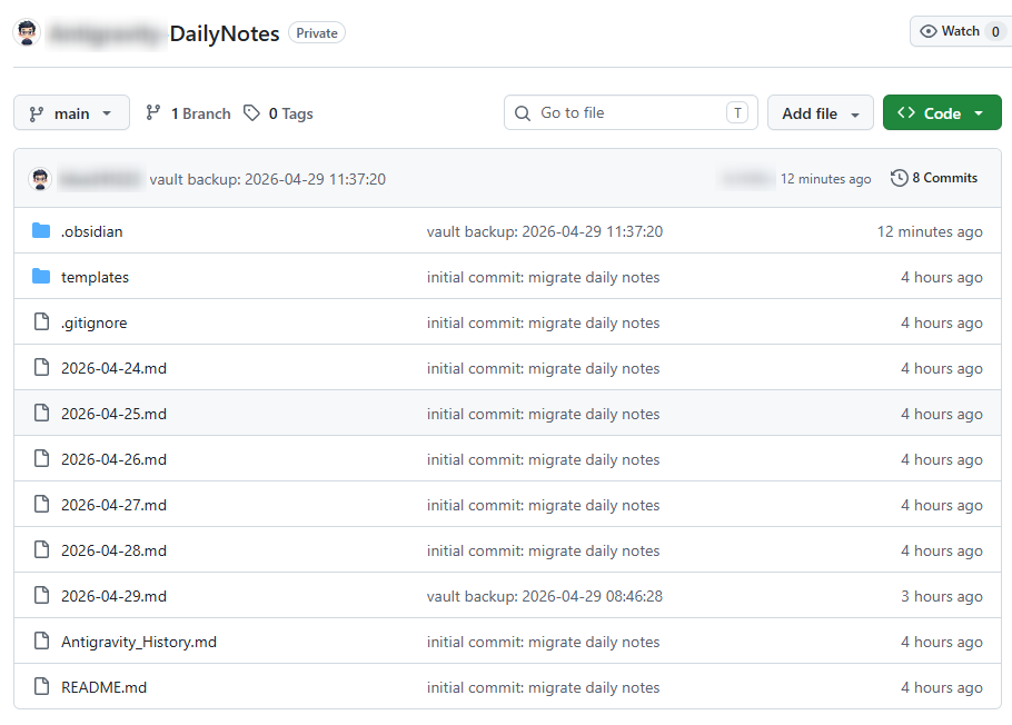 依頼メッセージ例: 「DailyNotesフォルダをGitHubのリポジトリ(プライベート)として作成して、同期して」