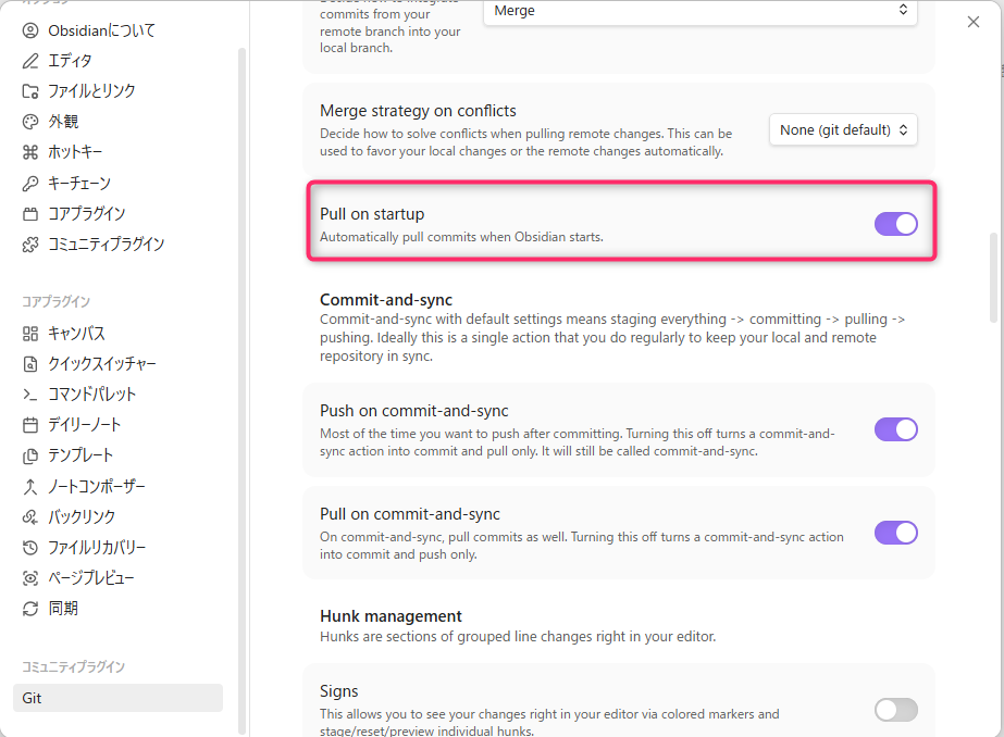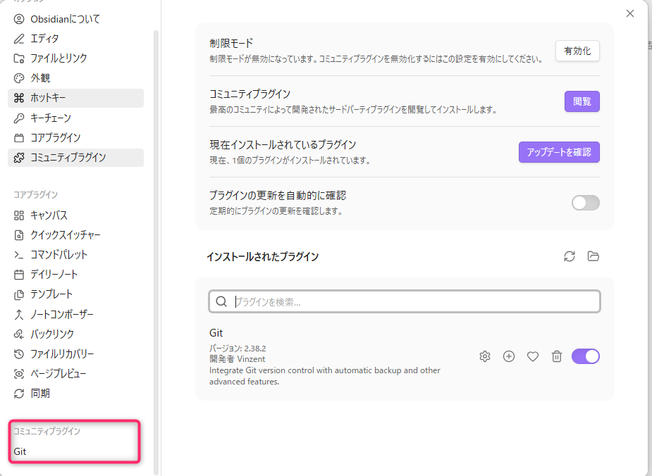 Obsidian自体にはGitHub同期機能はありません。「Git」というプラグインを追加します。