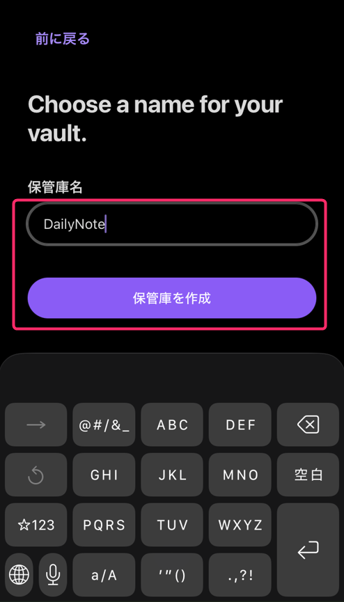 4.保管庫名(例:DailyNotes)を入力し、「Create」 をタップします。