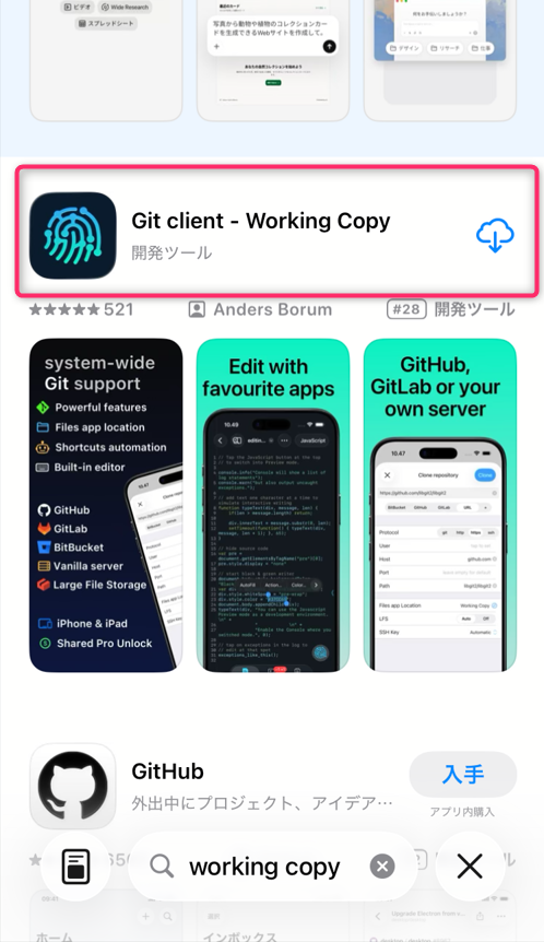 1.App Storeで 「Working Copy」 を検索してインストールします。