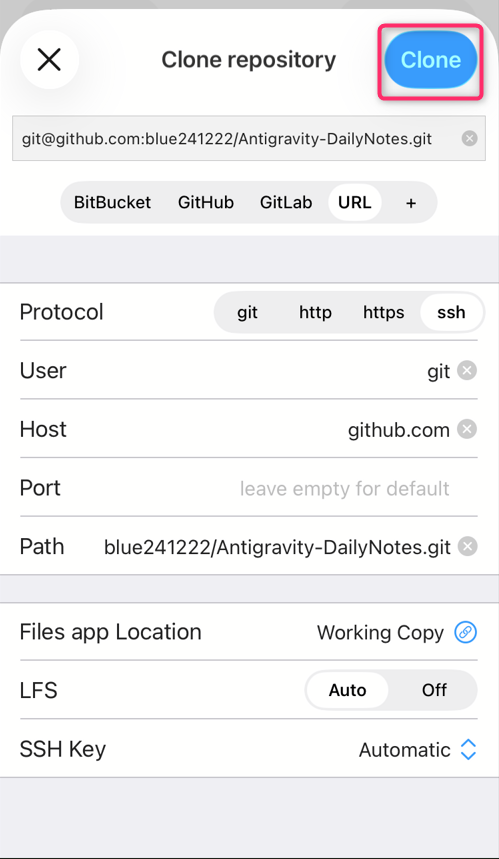 3-3. リポジトリをiPhoneにダウンロードする(クローン)