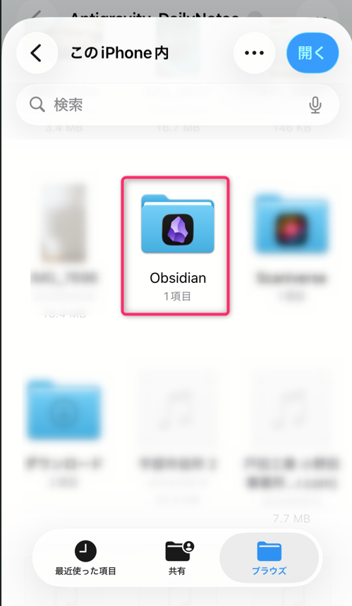 「このiPhone内」 > 「Obsidian」 の順に移動します。