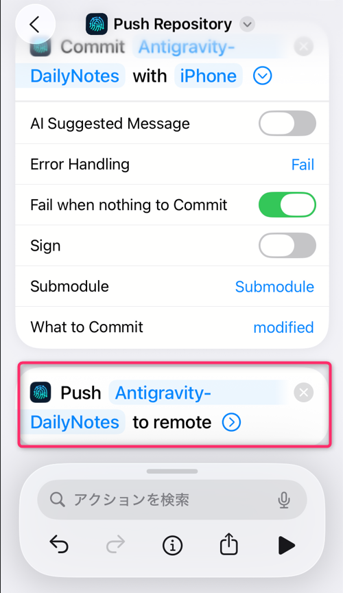 次へ進み、「Push Repository」 ショートカットを選択して完了です。