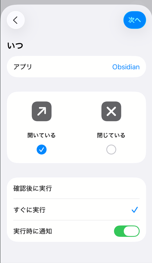 作ったショートカットを、Obsidianの開閉に連動させます。