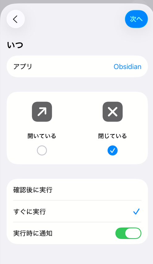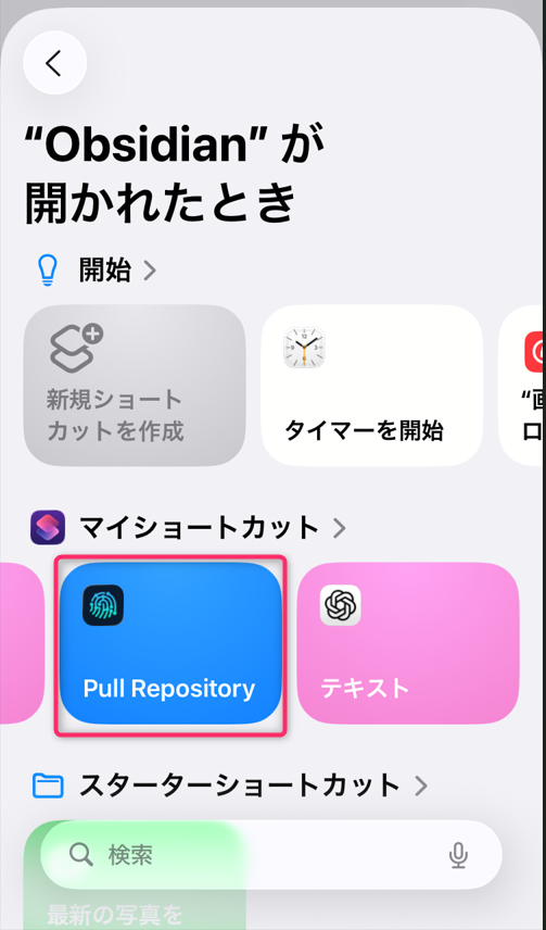 最後に「ショートカット」アプリを使って、Obsidianを開閉するだけで自動同期される仕組みを作ります。