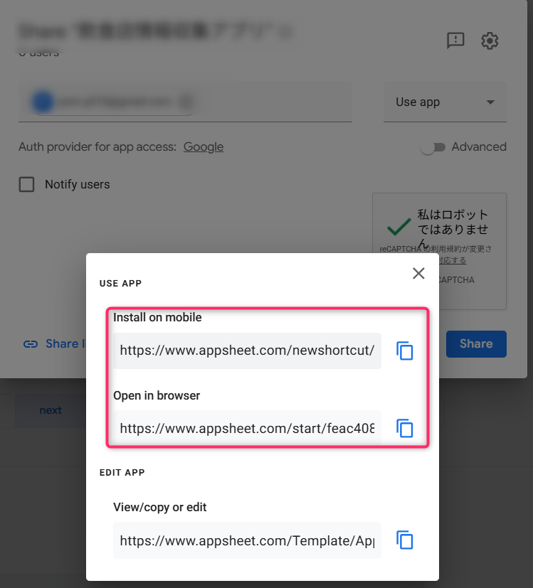 - 表示された画面の「USE APP」の欄から、以下の2種類のリンク両方をコピー(青いコピーアイコンをクリック)して、メモ帳等に控えます。