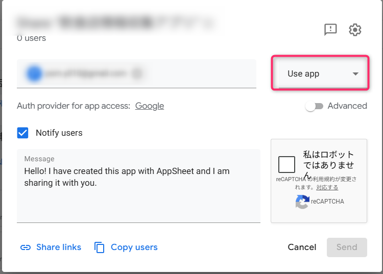 「Share app」ダイアログが開くので、招待したいユーザー(購入者)のメールアドレスを入力します。