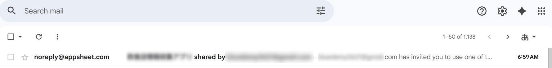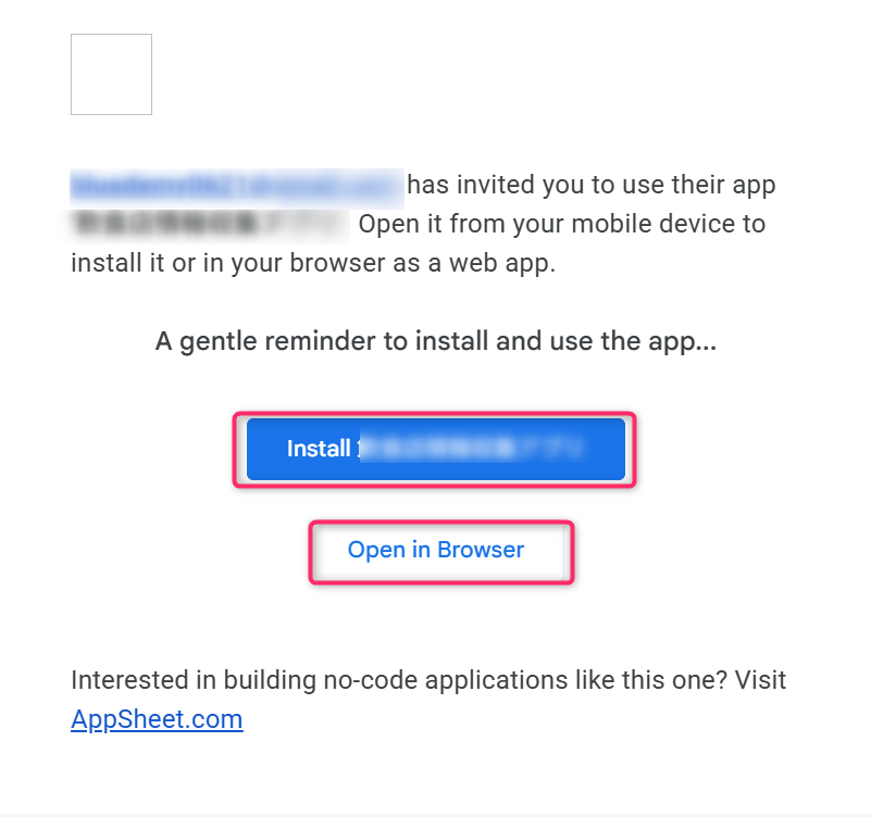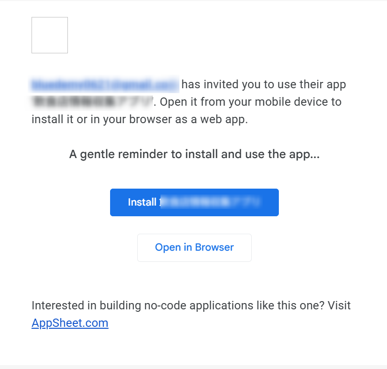 あなたのメールボックスに noreply@appsheet.com 、「〇〇アプリ shared by 出品者メールアドレス」という件名の招待メールが届きますので、それを開きます。