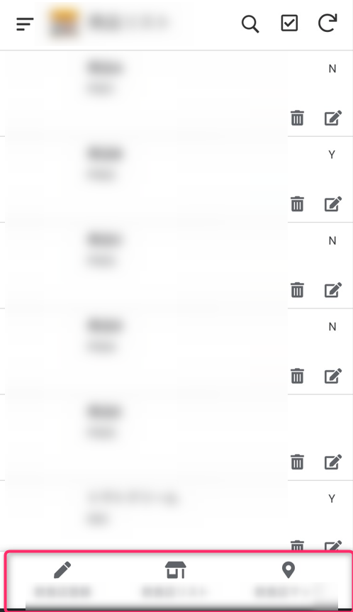 スマホ画面の下部に横に並んでいるアイコン群です。 ここをタップすると、よく使う「メイン機能の画面(一覧や入力画面など)」をサクサク切り替えられます。一番よく使うメニューです!