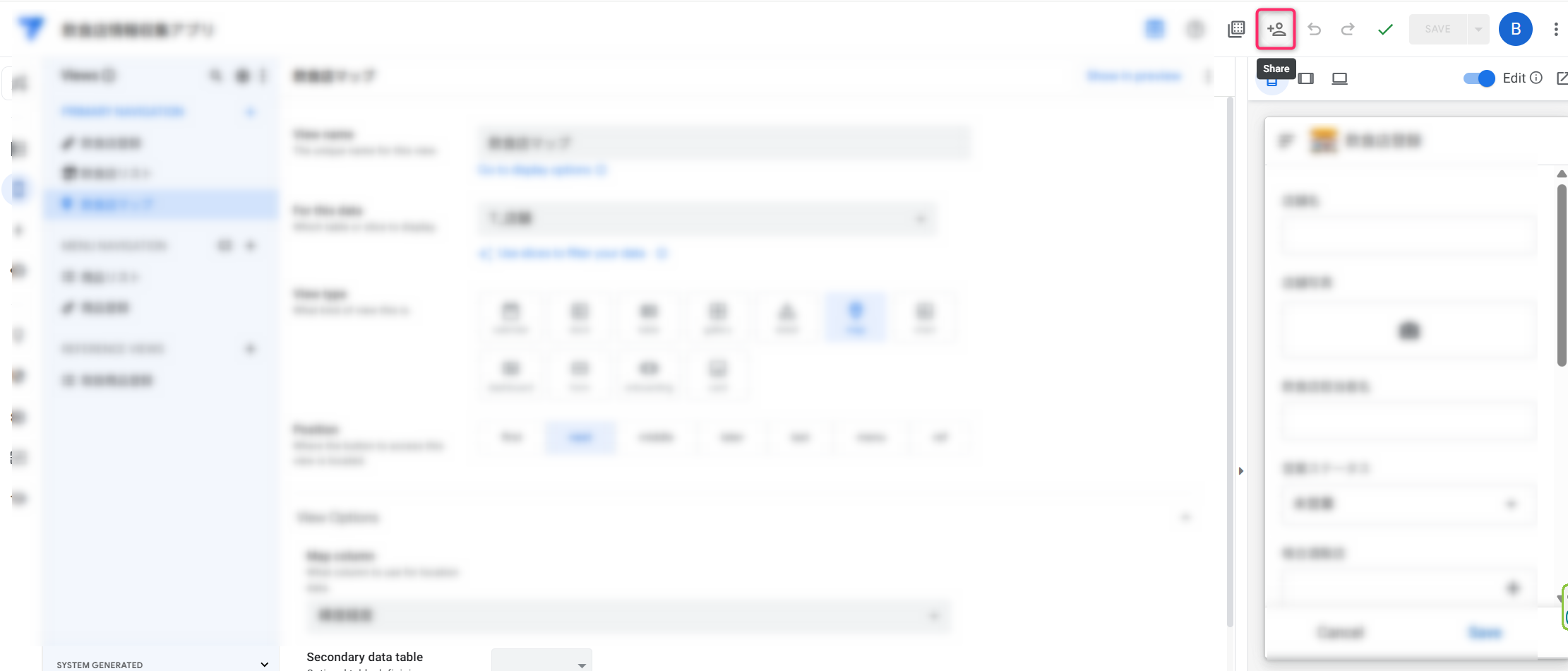 AppSheetエディタの画面右上にある**「共有アイコン(人型のマーク:Share)」**をクリックします。