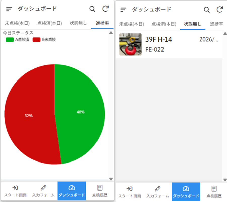 ボタン・入力欄を押しやすいサイズに統一。「正常=緑」「未点検・異常=赤」の色分けで状態がひと目でわかるUIに - リアルタイム「未点検リスト」が自動生成: