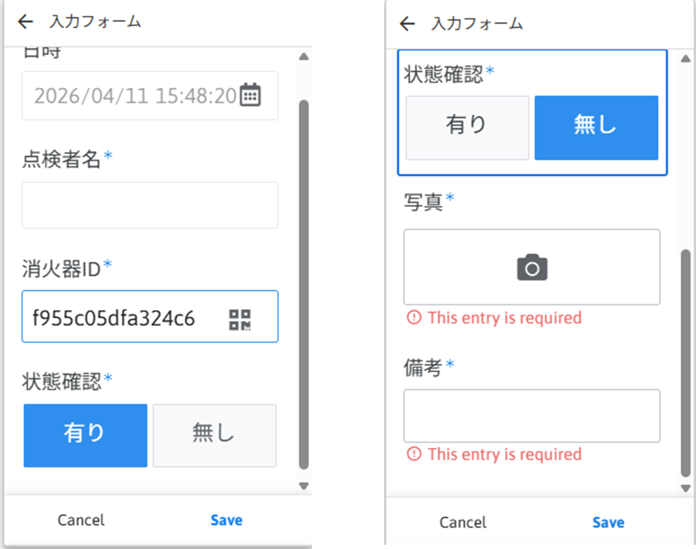 ▲ 通常はQRコードでの入力と状態確認のワンタップ入力のみ。異常時のみ写真・備考欄が自動で表示されます。