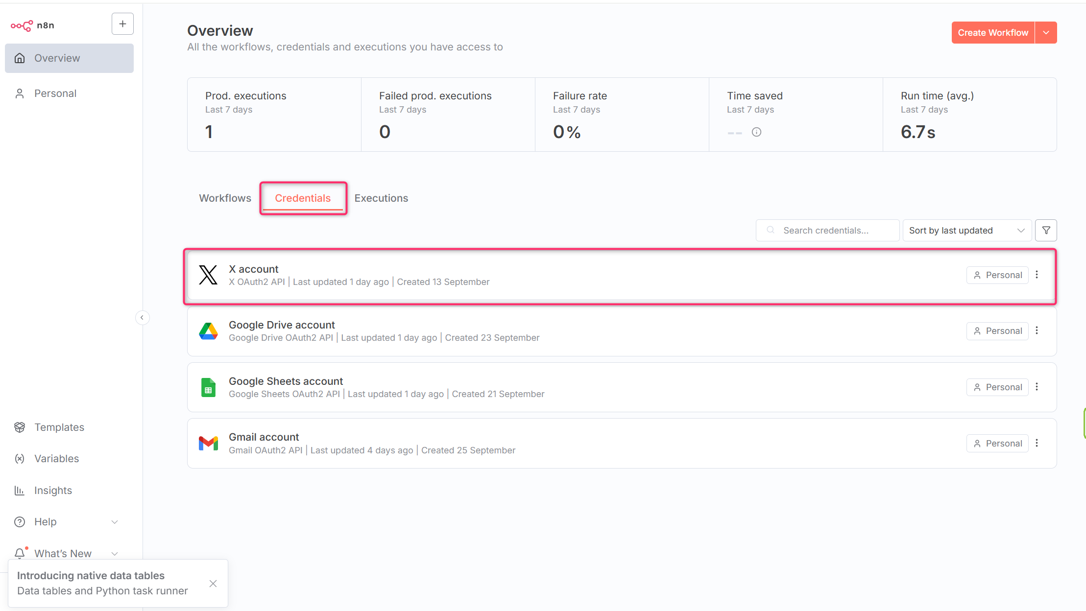 2.n8nを立ち上げ、「Create Workflow」の右の▼をクリック、「Create Credential」をクリックする。