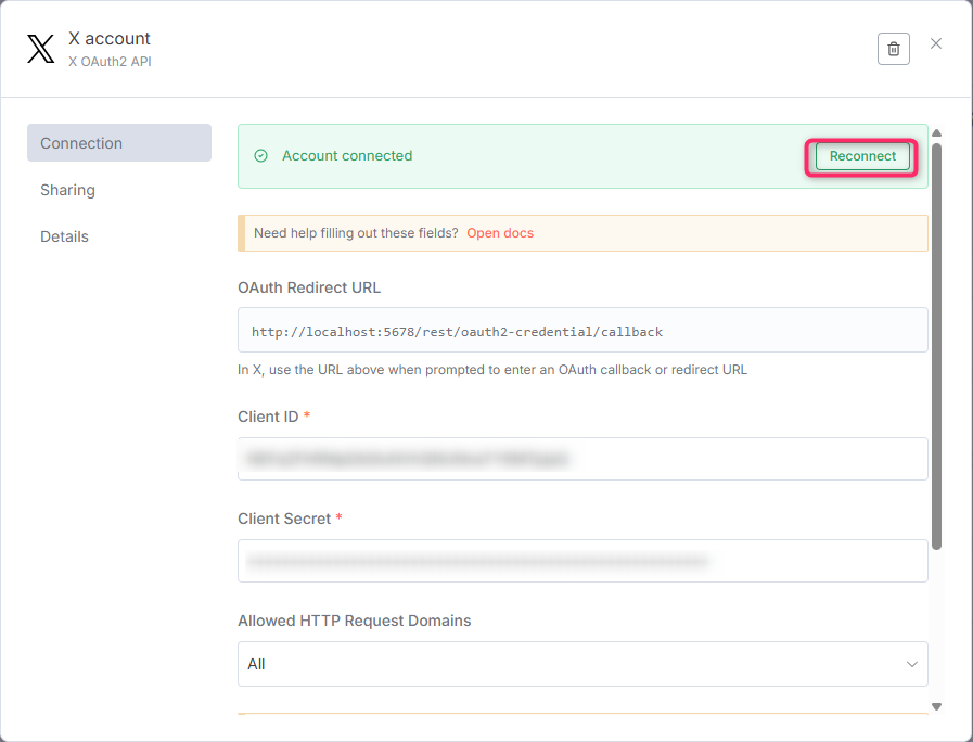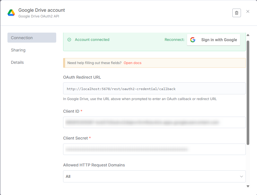 4.「OAuth Redirect URL」、「Client ID」、「Client Secret」はGoogle Sheets OAuth2 APIと同じものを入力し、認証を行う