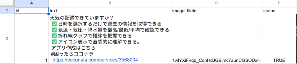 5. スプレッドシートの列を以下の構成にする。image_fileIDはGoogle Driveにアップロードした画像のIDを記載しておく。statusはFALSEとしておく