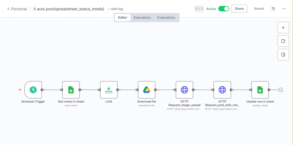この記事では、スプレッドシートの1行=1投稿として、本文とGoogle Driveの画像を使い、n8nでX(旧Twitter)へ画像付きで自動投稿し、成功した行だけStatusをTRUEに更新するまでを解説します。各ステップに画像も組み込んでいるので、うまくいかないときは参考にしてください