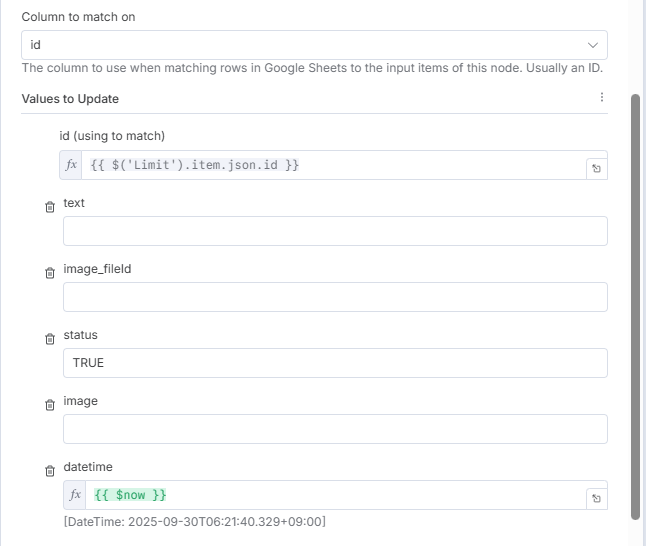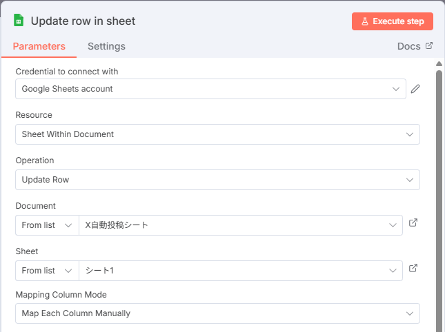- 流れ:Drive(Download)→ HTTP Request(/2/media/upload)→ HTTP Request(/2/tweets)→ Sheets(UpdateでTRUE)